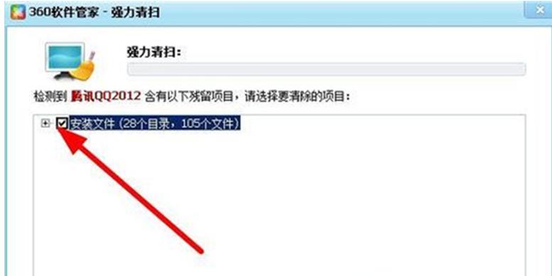 6、接著找到騰訊qq,你會(huì)發(fā)現(xiàn)存在殘留,點(diǎn)擊右側(cè)的【強(qiáng)力清掃】,我們進(jìn)一步刪除無(wú)用的文件