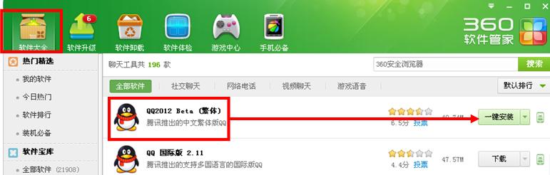 12、接著來(lái)到360安全衛(wèi)士,在【軟件管家】中找到【軟件大全】,在軟件寶庫(kù)中你會(huì)看到有很多軟件,找到qq2012,然后點(diǎn)擊右側(cè)的一鍵安裝。等待幾分鐘,安裝就可以完成了。啟動(dòng)你的qq,看看問題解決了沒有。
