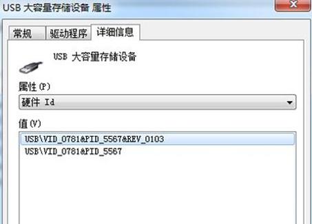 3、復(fù)制“通用串行總線控制器”中“USB大容量存儲(chǔ)設(shè)備”的硬件ID:在“設(shè)備管理器”中展開(kāi)“通用串行總線控制器”列表,找到“USB大容量存儲(chǔ)設(shè)備”,在它的“屬性”窗口中點(diǎn)擊“詳細(xì)信息”標(biāo)簽,復(fù)制出它的硬件ID也需要保存;