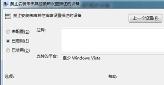 4、找出U盤(pán)的硬件ID后通過(guò)設(shè)置組策略來(lái)實(shí)現(xiàn),在開(kāi)始菜單“運(yùn)行”處輸入“gpedit.msc”,依次展開(kāi)“計(jì)算機(jī)配置”-“管理模板”-“系統(tǒng)”-“設(shè)備安裝”-“設(shè)備安裝限制”,打開(kāi)右側(cè)的“禁止安裝未由其他策略設(shè)置描述的設(shè)備”,在彈出的窗口中選擇“已啟用”,再點(diǎn)擊“確定”按鈕;然后再打開(kāi)“允許安裝與下列設(shè)備ID相匹配的設(shè)備”,設(shè)置為“已啟用”,在“選項(xiàng)”窗格中點(diǎn)擊“顯示”,把第三步中復(fù)制好的硬件ID分別添加進(jìn)去,在這里請(qǐng)您注意:只有在第一步設(shè)置為“已啟用”的前提下第二部的設(shè)置才會(huì)生效,這樣就可以來(lái)禁止策略沒(méi)描述的USB設(shè)備;