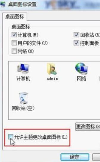 2、在“桌面圖標(biāo)設(shè)置”對(duì)話框中,將“允許主題改變桌面圖標(biāo)”前面的復(fù)選框取消勾選,然后單擊“確定”。