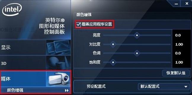 4、切換到“媒體”選項(xiàng)止,選擇“顏色增強(qiáng)”項(xiàng),通過勾選“覆蓋應(yīng)用程序設(shè)置”選項(xiàng)卡,然后就可以調(diào)整“亮度”、“對(duì)比度”、“色調(diào)”和“飽和度”。
