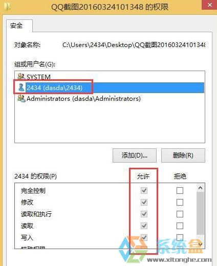 3、在圖片權(quán)限界面中,點(diǎn)擊電腦的用戶名(圖中用戶名是2434),然后勾選“完全控制”,最后點(diǎn)擊“確定”,如圖所示: