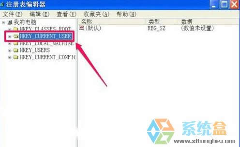 第二步、注冊(cè)表編輯器窗口打開(kāi)之后,在五個(gè)根鍵里面直接選中“HKEY_CURRENT_USER”選項(xiàng),再結(jié)合前面的“+”符號(hào),打開(kāi)其子項(xiàng)。