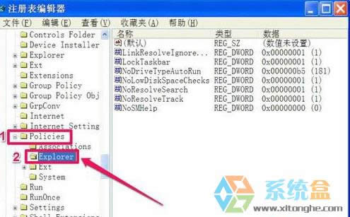 第三步、接著依次打開(kāi)[HKEY_CURRENT_USER\Software\Microsoft\Windows\CurrentVersion\PolicIEs\Explorer]注冊(cè)項(xiàng),最后選定Explorer這一項(xiàng)。