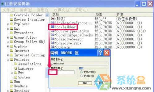 第五步、雙擊打開(kāi)LockTaskbar項(xiàng),彈出一個(gè)編輯DWord值窗口,在數(shù)據(jù)數(shù)值下,其當(dāng)前值為“1”,將其修改為“0”,然后按“確定”,就修改完了。