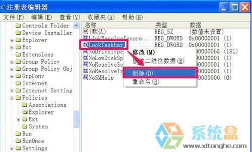 其實(shí)還有一個(gè)比較簡(jiǎn)單的方法,就是在“LockTaskbar”選項(xiàng)上面點(diǎn)擊右鍵,選擇菜單里面的“刪除‘,接著確認(rèn)刪除就行了。