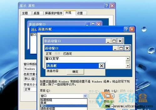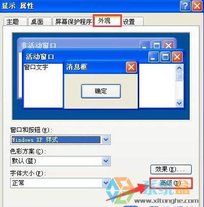 2、切換到“外觀”標簽頁,點右下角的“高級”按鈕進入“高級外觀”設置窗口。