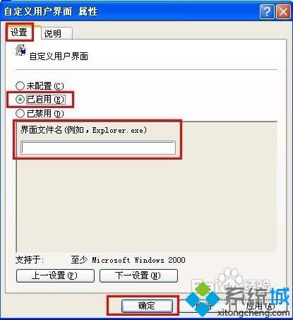 5、在彈出的“設(shè)置”選項(xiàng)卡下選擇“已啟用”,在界面文件名框中鍵入想要系統(tǒng)啟動(dòng)時(shí)加載的程序,單擊“確定”。